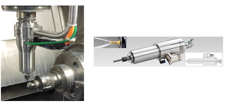 當機床數(shù)控加工中心鉆頭或者銑刀以數(shù)萬轉高速旋轉碰到硬金屬的時候,刀具很快就會變熱,加工零件和刀具都會受熱膨脹,這時受影響的不只是加工速度,還有加工精度。 特別是在深孔加工,Sycotec研發(fā)了帶內(nèi)部冷卻的高速數(shù)控機床主軸4040 DC-S-ER-DD,通過先進的設計解決了主軸高速旋轉的同時中孔冷卻,在冷卻液壓力為80bar時所須克服的阻力和對旋轉精度的影響,4040 DC-S-ER-DD 機床主軸在輸出較大功率的同時還保持低溫,延長主軸的使用壽命。